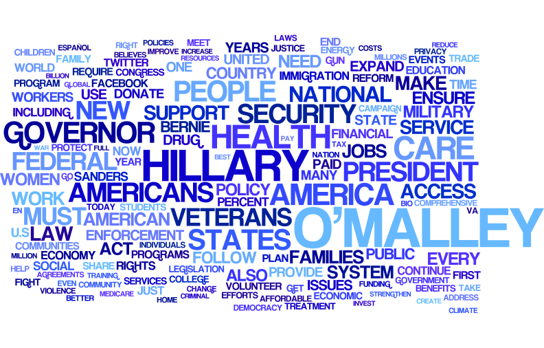 Still, websites offer a ready source of information on the distilled message each candidate has prepared on "the issues". So to gather this data, I went to each of the candidate's websites, found whatever page (or usually pages) they had listed as "issues" or similar, and wholesale copied all the text. This totaled over 128k words, 74k from the Democrats and 54k form the Republicans. Here are two word clouds (generated via